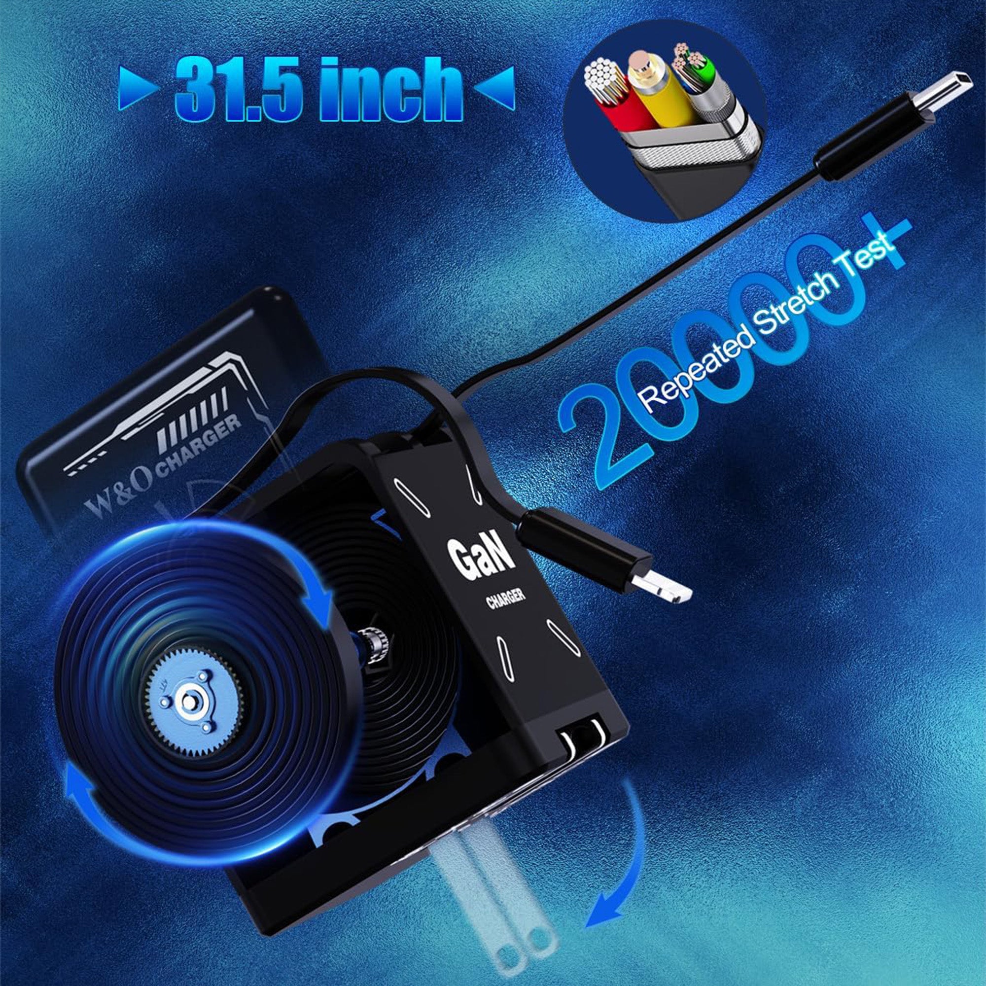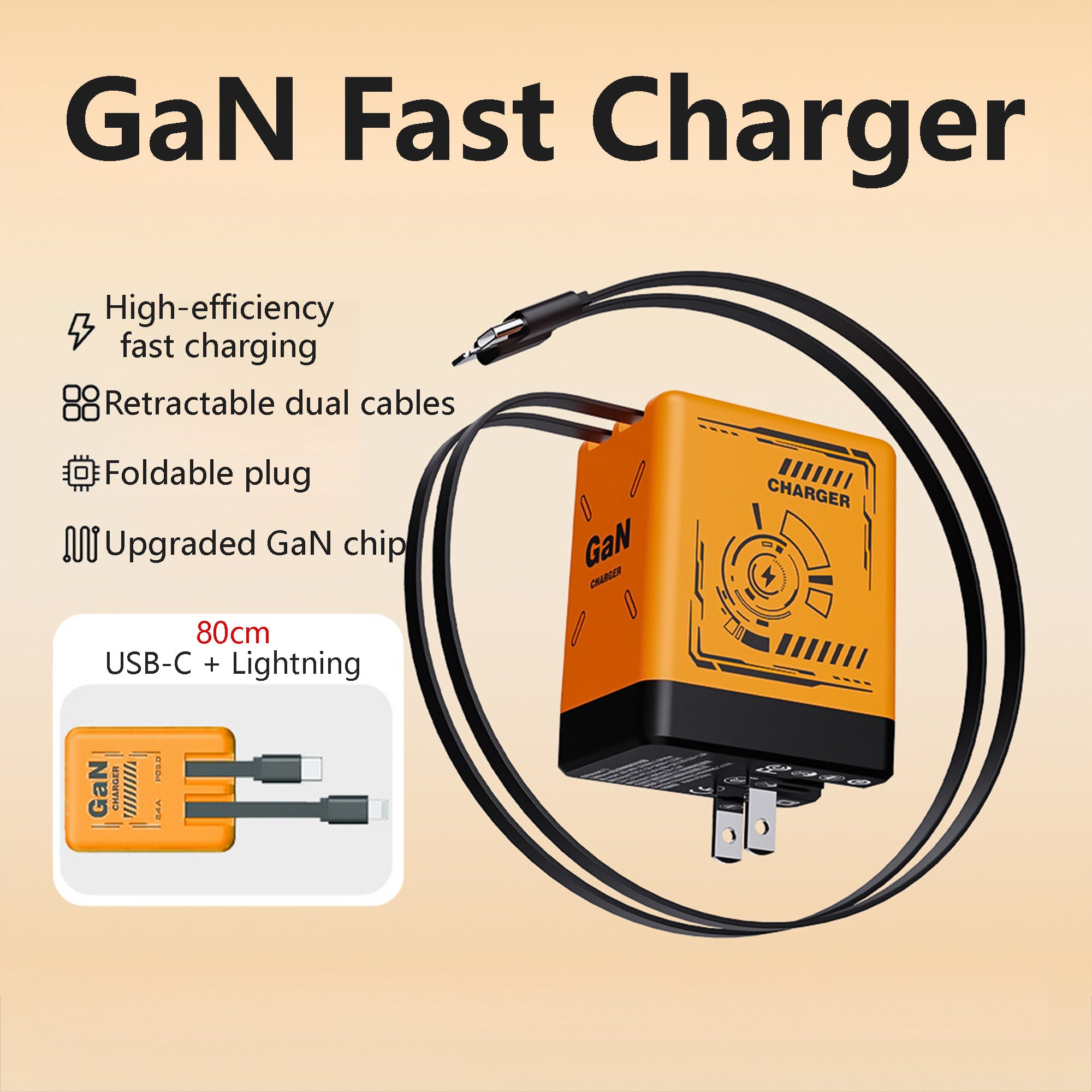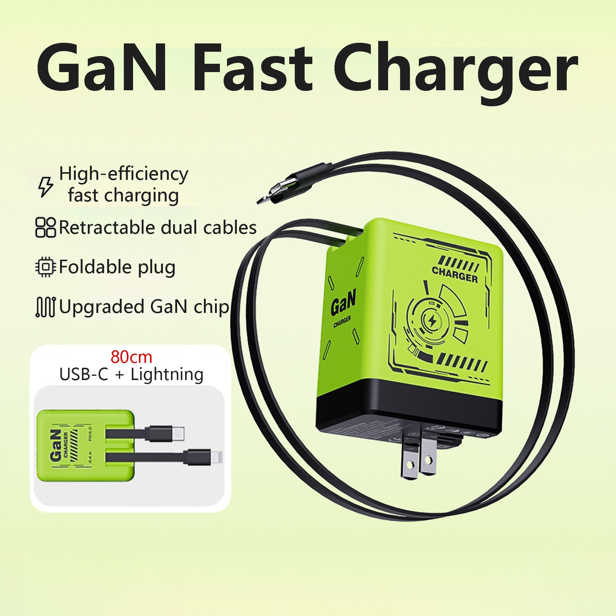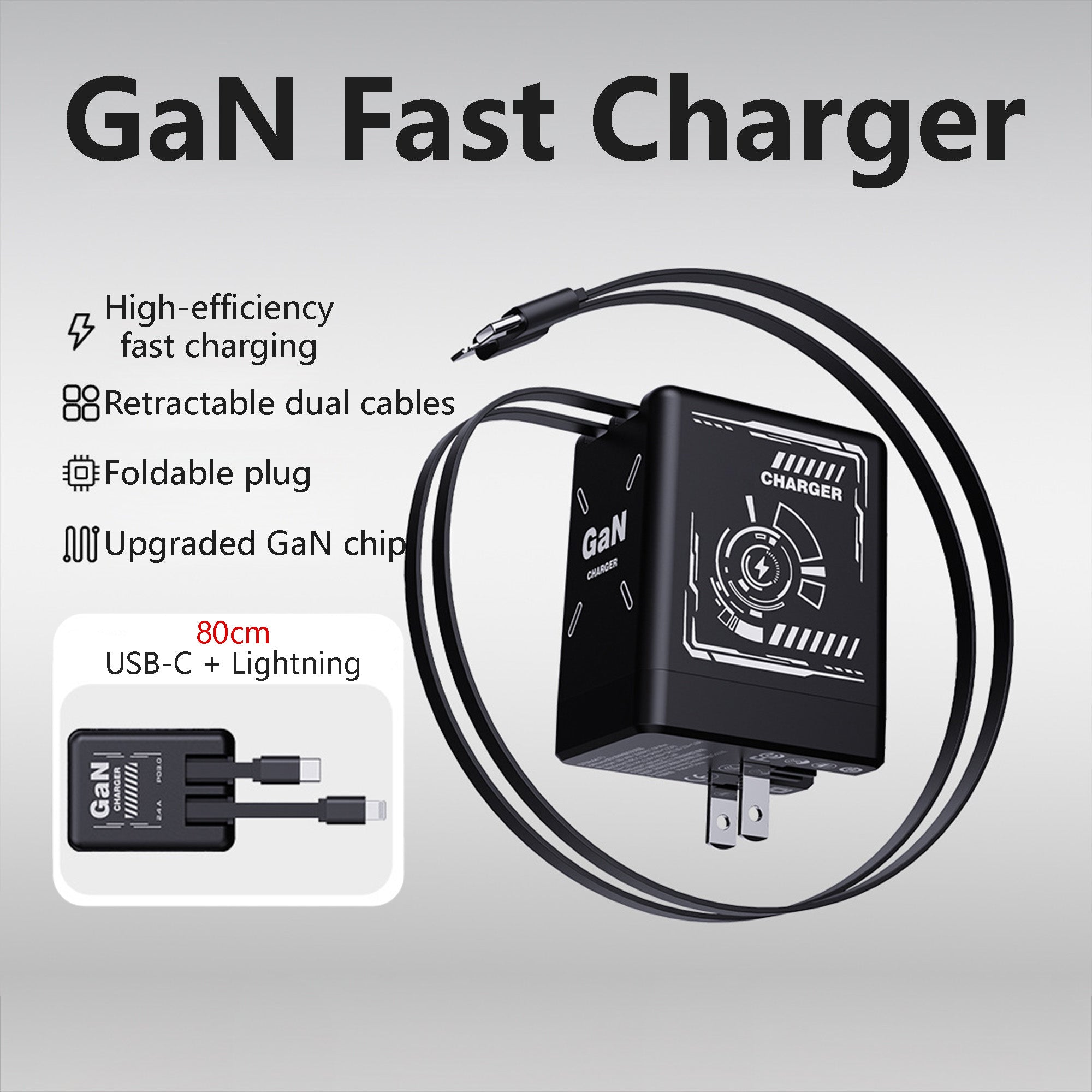 120W GaN Retractable Charger Fast Charger with Lightening and Type-C Cables