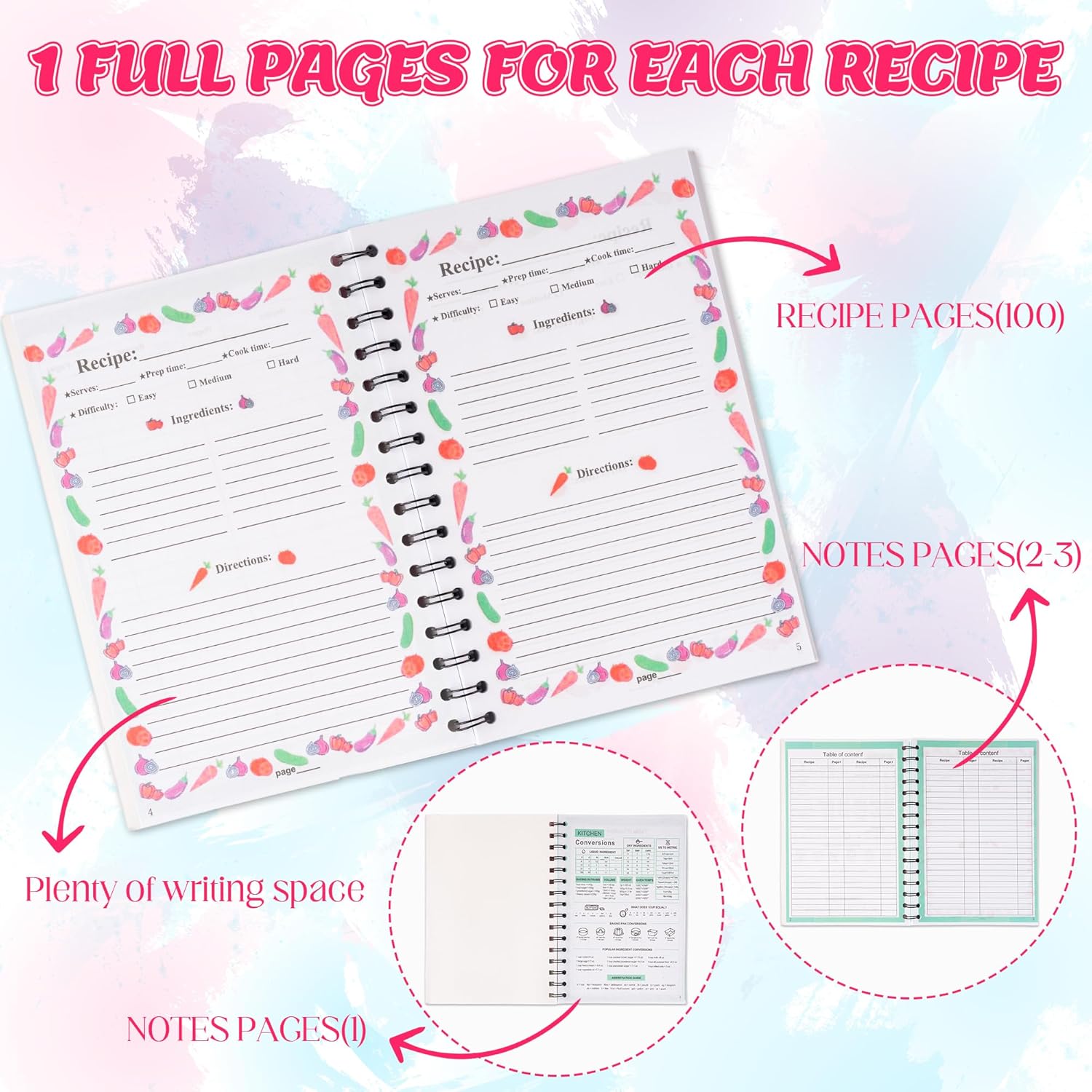 The cookbook includes 1 page of cooking guide charts and 100 blank pages for writing original recipes, accommodating up to 100 recipes. Ample space to record ingredients, steps, and special notes for crafting your unique recipes. This blank recipe book makes a thoughtful gift for food enthusiasts, novice cooks, or anyone looking to document their recipes. It serves as both a practical tool for experimenting with new dishes and a treasured keeper of classic recipes.