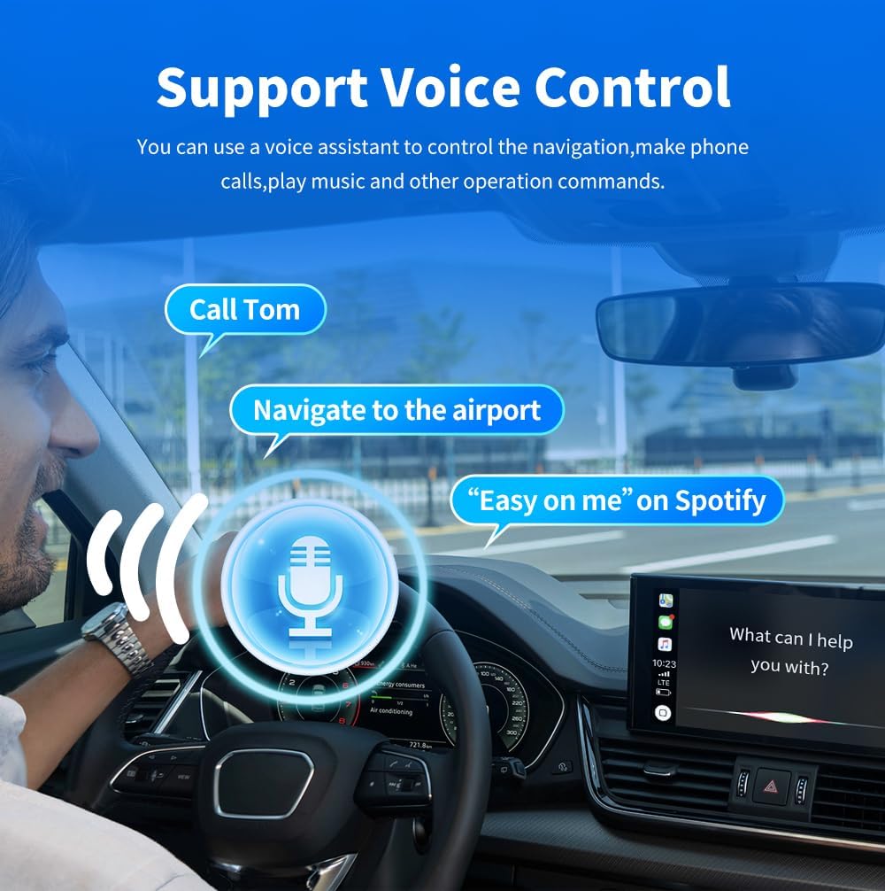 Enjoy navigation, Apple Music streaming, hands-free calls, and voice commands for safer driving and a clutter-free dashboard. The wireless adapter is perfectly compatible with 98% of factory-wired CarPlay vehicles, supporting iPhones iOS 10 or later and Android 11 or later. In addition, the car wireless adapter comes with a USB-to-USB-C converter that perfectly fits both USB and USB-C car ports.