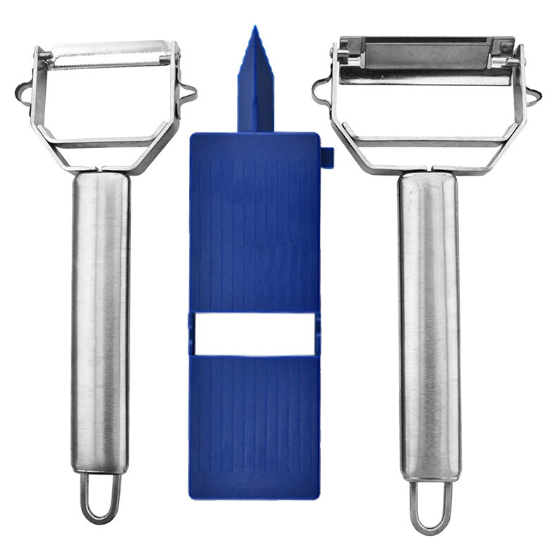 Ergonomic kitchen peeler with shredder and mini mandolin slicer