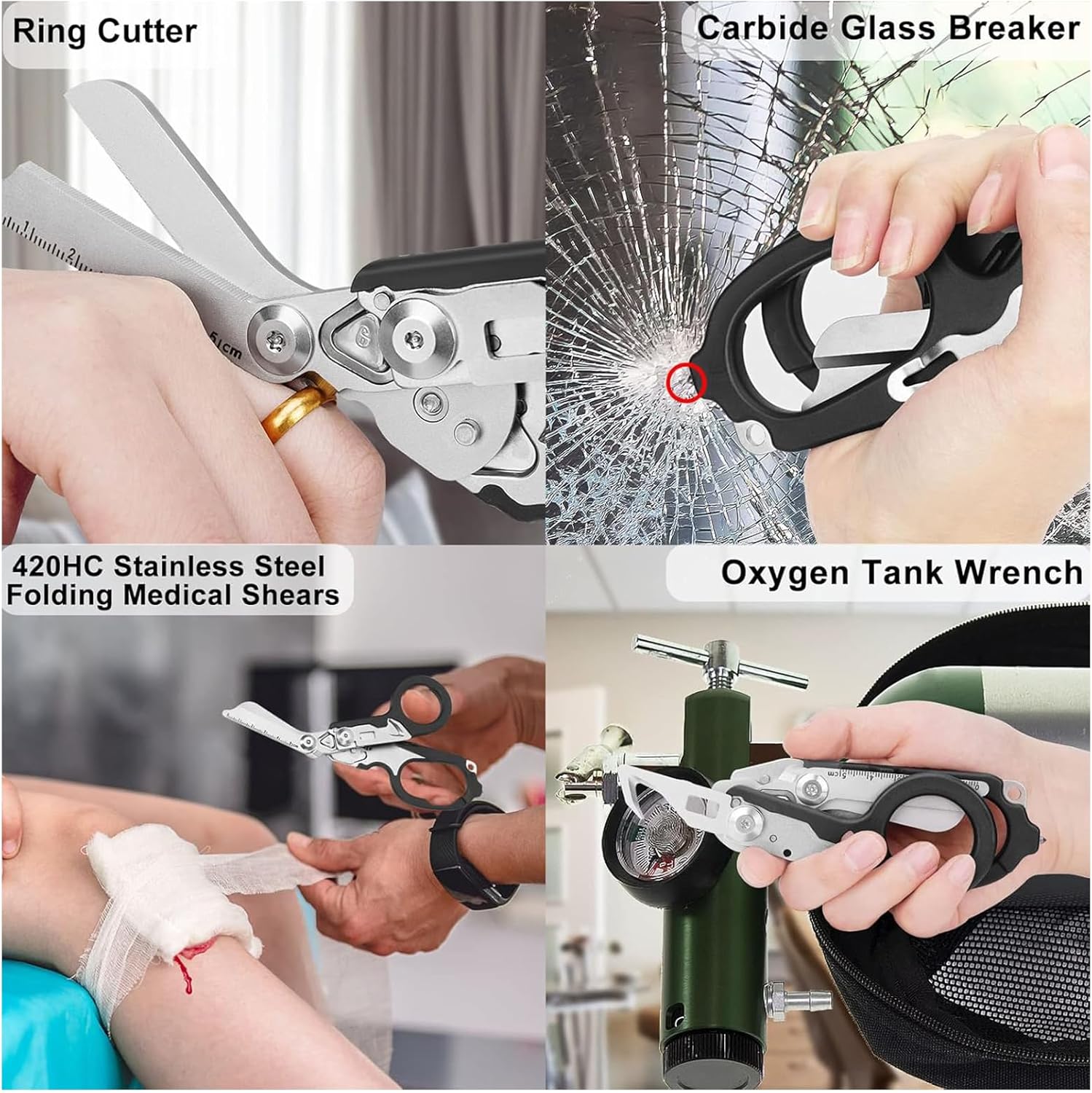 This device combines emergency scissors, a seatbelt cutter, a ring cutter, a ruler, an oxygen cylinder wrench, and a glass breaker into one versatile tool, easily handling various situations.