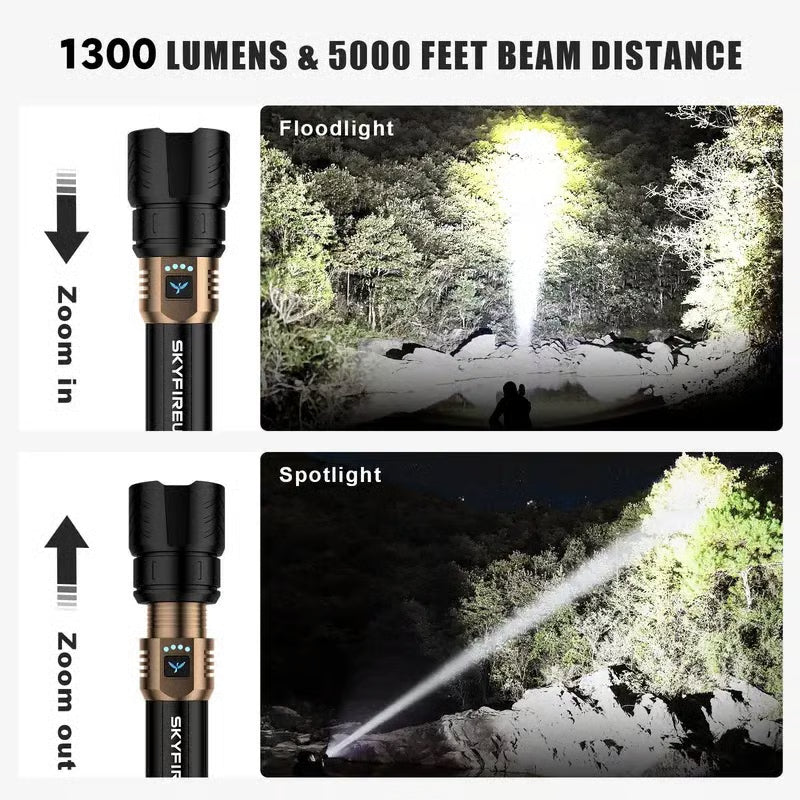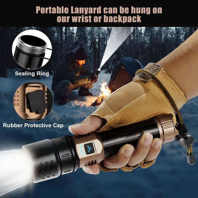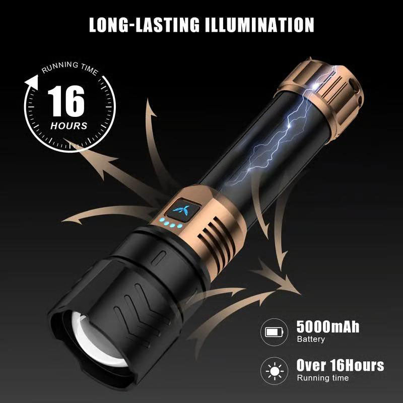The flashlight boasts a strong light range of over 900m, perfect for long-distance projection. It features a 5000mAh battery, offering an endurance of 16 hours. The white lamp bead ensures a bright, long-distance projection. With a solid build and blinding brightness, compact enough to fit in your backpack, survival bag, or car glove compartment.