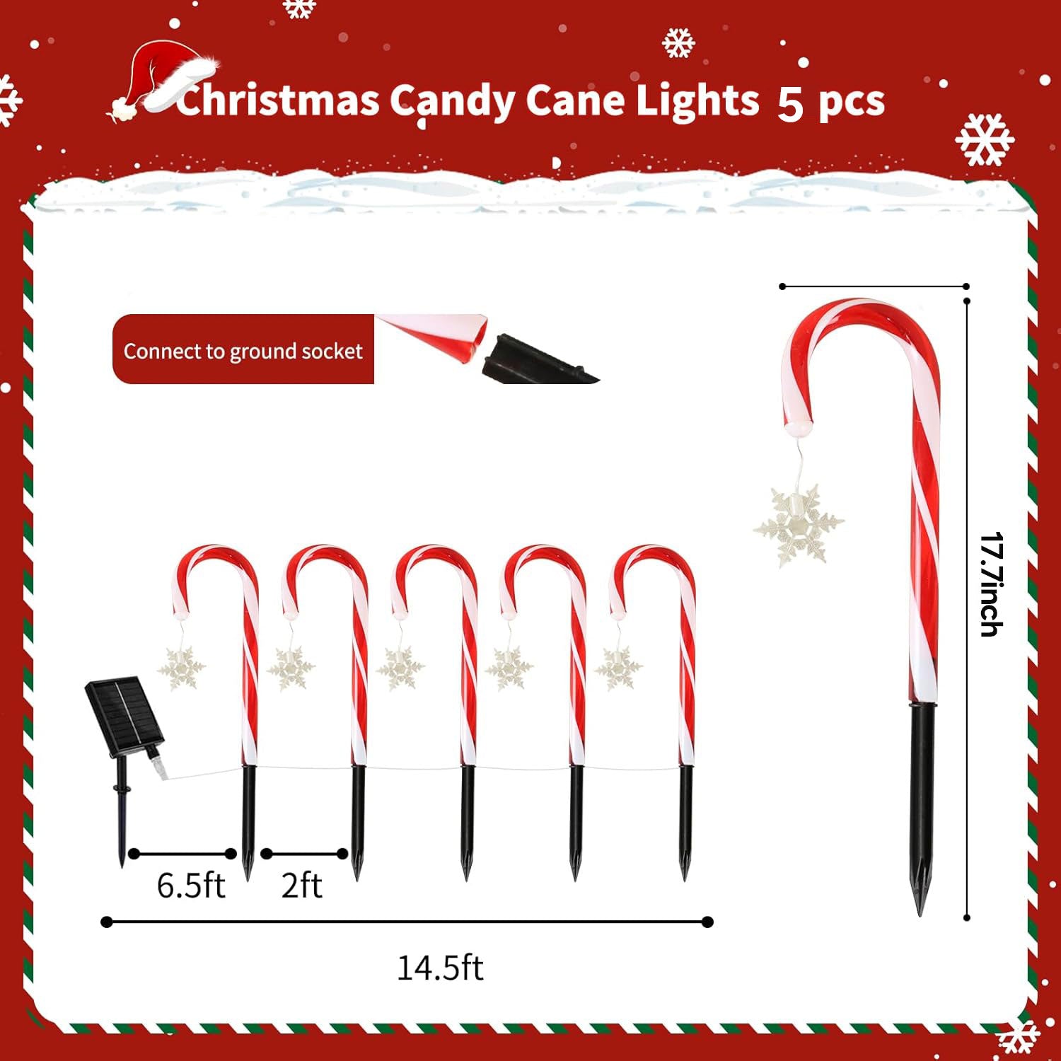 Solar Candy Cane Lights are equipped with a 2.5-inch large solar panel and a 1600 mAh energy storage battery, which can light up for 15-30 hours with only 4-7 hours of sunlight.
