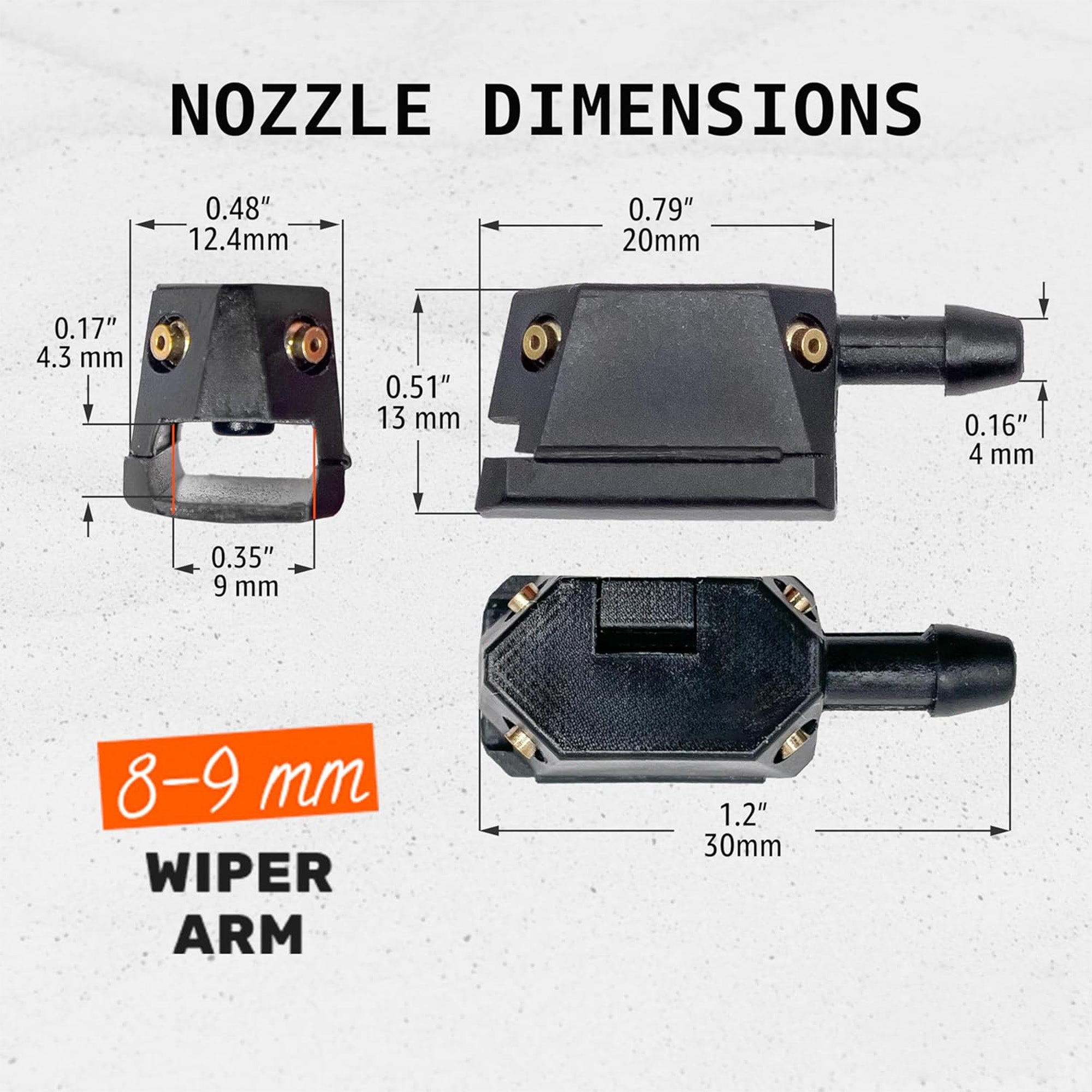 - Easy to install in few minutes and effectively extend the wiper blade life time.Automotive wiper washer spurter adopts a 4-hole straight column nozzle jet design, which can make it spray water on your car windshield evenly.