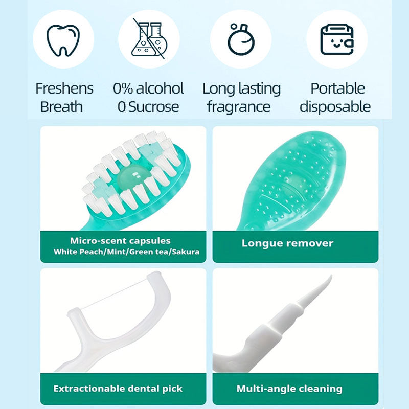 Each disposable mini toothbrush combines a toothbrush, mini toothpaste applicator, dental floss, toothpick, and tongue scraper, giving you a full-mouth freshness anytime, anywhere.