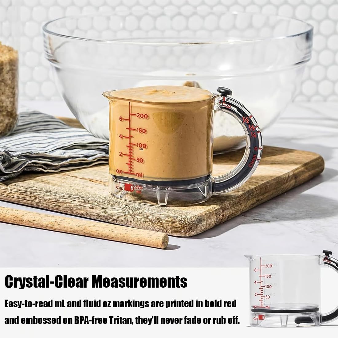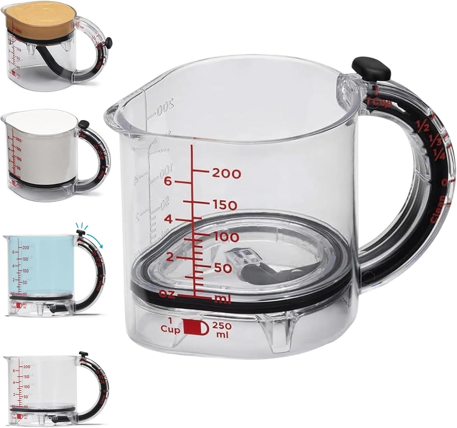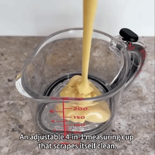 Its scraper-style seal base, push up measuring cup features a sealing edge that scrapes the walls clean as it moves, making sticky ingredients like honey or peanut butter easy to release without waste and mess. Perfect for baking, cooking, and portioning liquids or dry ingredients while saving valuable kitchen space.