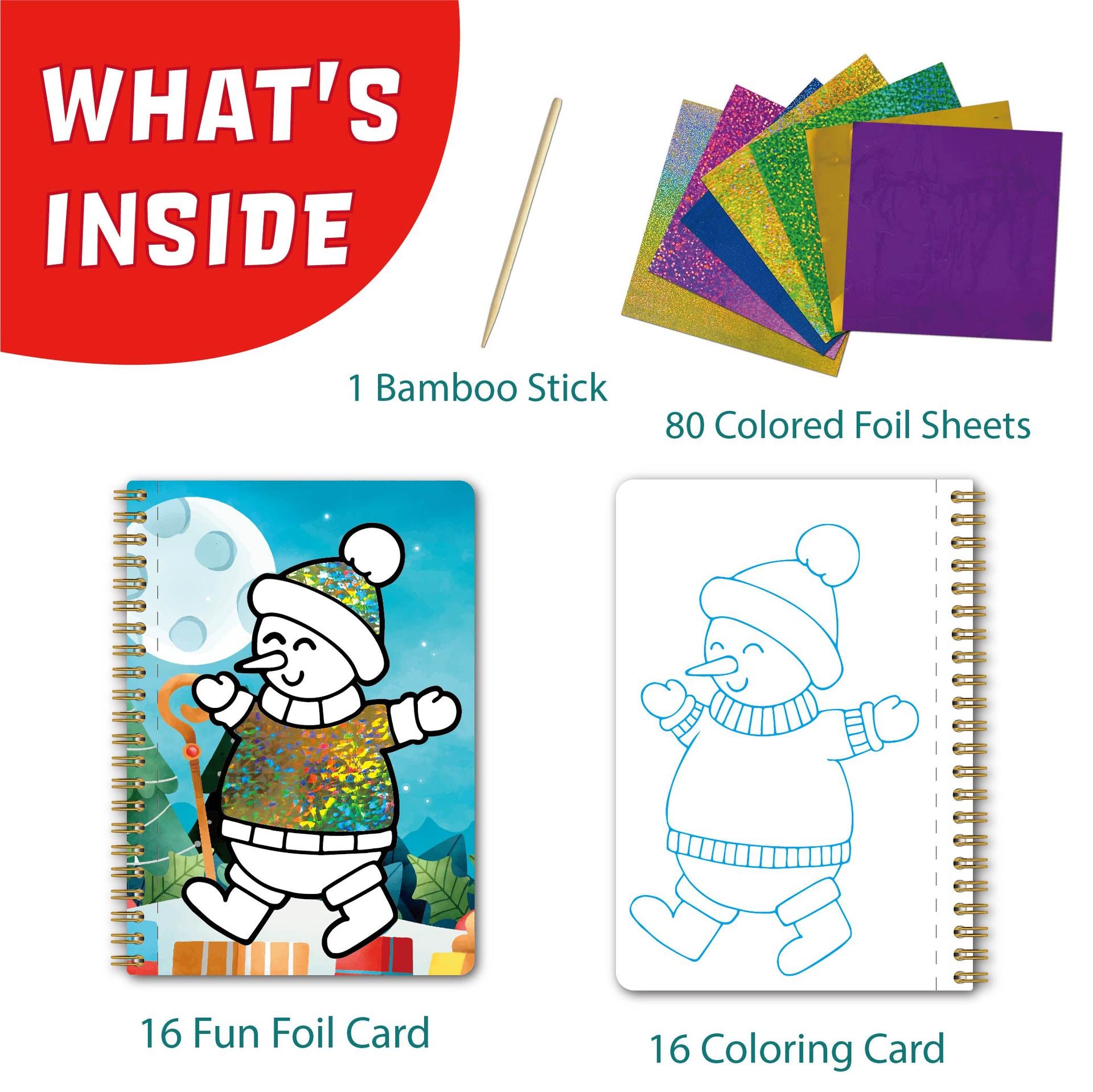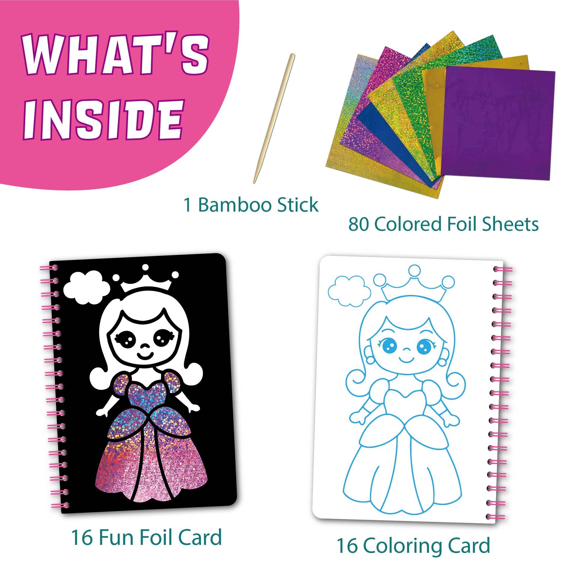 ▶16 reusable foil art & coloring cards, 80 colorful foil sheets, 8 crayons, and a bamboo stick for easy peeling.