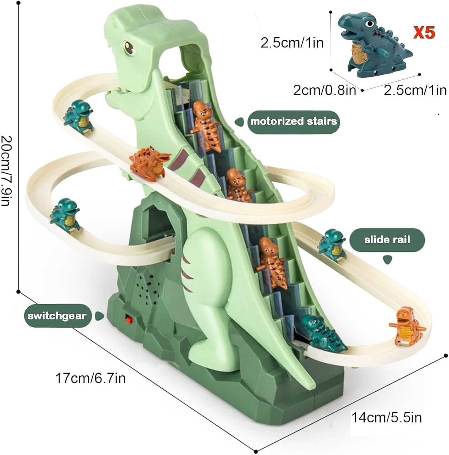 Watch 5 colorful dinosaurs climb stairs autonomously with flashing lights and upbeat music! This electric racing track toy sparks imaginative play, encouraging kids to cheer on their dinos while fostering curiosity about movement and cause-effect relationships. Ideal for boys and girls who love Jurassic adventures, combining education, motor skill development, and screen-free entertainment.
