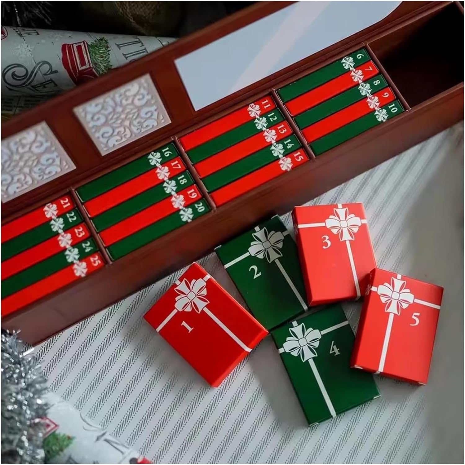 - The gift box features 25 individual compartments arranged according to the Christmas countdown, each corresponding to a day, rich in design details.
