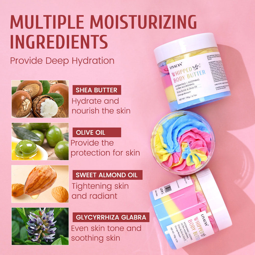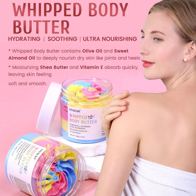 The three-color ice cream whipped body butter has become the only choice for those who pursue exquisite skin care and desire radiant skin, thanks to its unique appearance, natural nourishing ingredients, excellent skin care effects and comfortable use experience. Come and start this sweet and nourishing skin care journey, and let your skin experience unprecedented beauty.