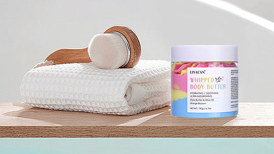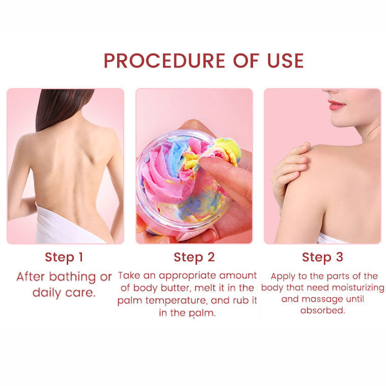 ☑️After bathing or daily care, scoop an appropriate amount of body butter into the palm of your hand, gently rub it to emulsify it, and quickly absorb it into the skin without leaving a trace of stickiness.