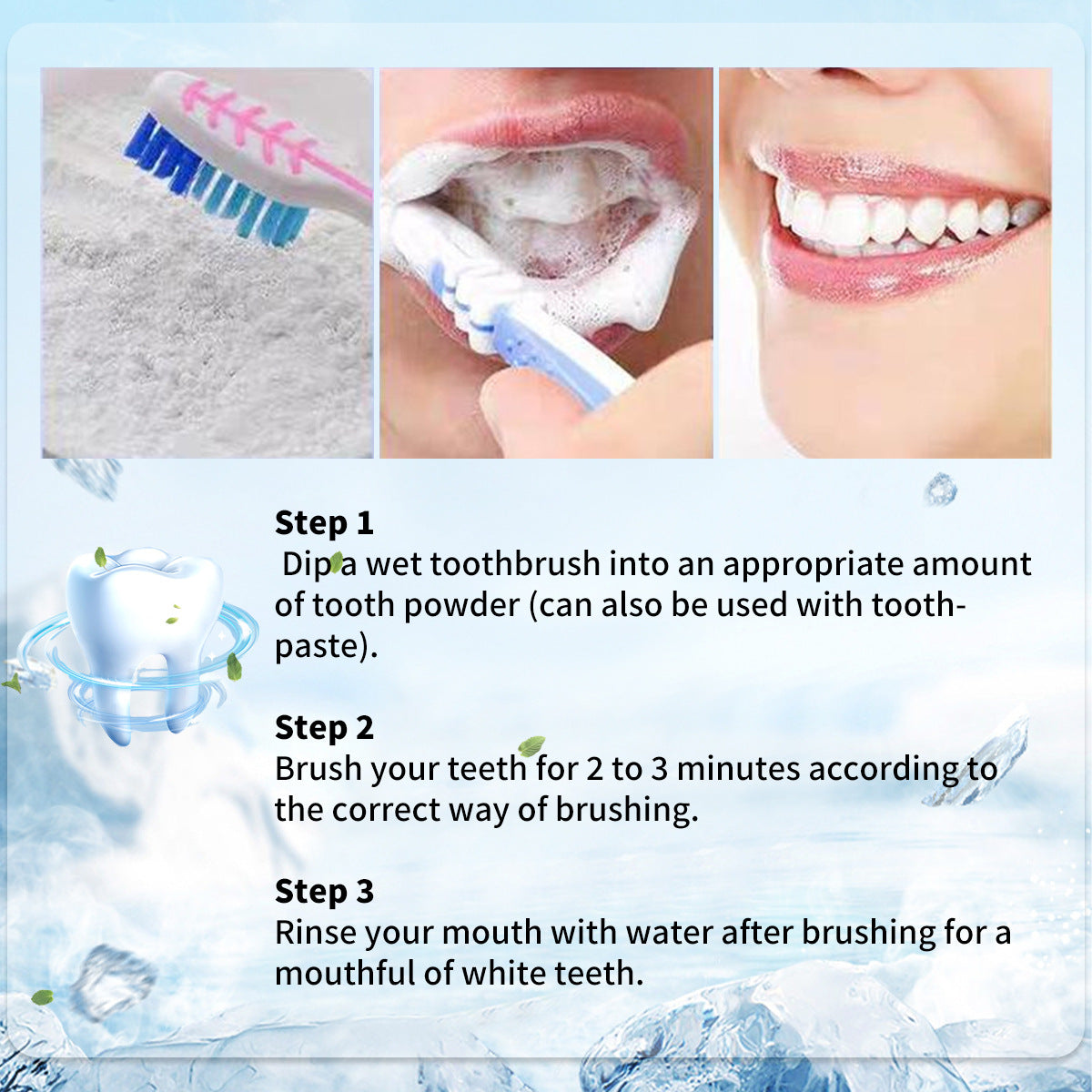 When brushing your teeth daily, use this tooth powder with your teeth. Take a small amount and rub it gently on the surface of your teeth for 2-3 minutes of intensive whitening care. Use moderate force during the rubbing process. After finishing, rinse your mouth with water. You can use mouthwash with it to achieve better whitening and oral care effects.